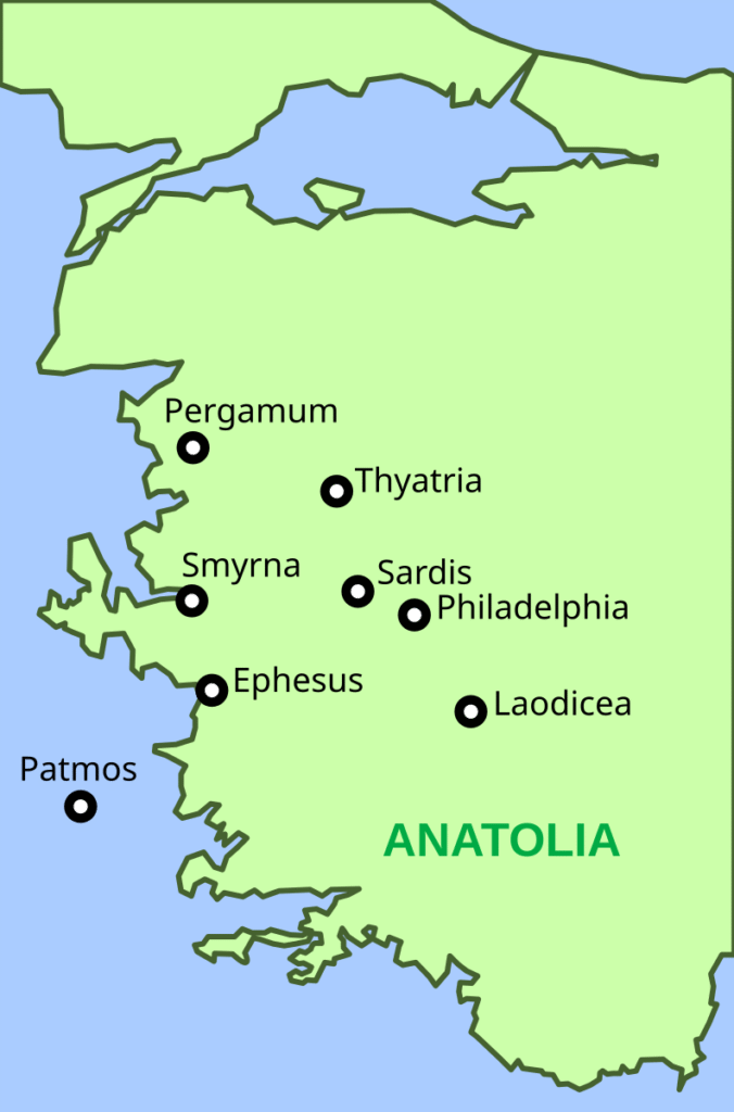 According to [[Revelation 1#Verse 11|Revelation 1:11]], on the island of [[Patmos]] in the far east of the [[Aegean Sea]], [[Jesus]] instructed [[John of Patmos]] to “[w]rite in a book what you see in your visions, and send it to the seven churches, to [[Ephesus]], to [[Smyrna]], to [[Pergamon|Pergamum]], to [[Thyatira]], to [[Sardis]], to [[Alaşehir|Philadelphia]], and to [[Laodicea on the Lycus|Laodicea]].”{{efn|NA28: λεγούσης Ὃ βλέπεις γράψον εἰς βιβλίον καὶ πέμψον ταῖς ἑπτὰ ἐκκλησίαις, εἰς Ἔφεσον καὶ εἰς Σμύρναν καὶ εἰς Πέργαμον καὶ εἰς Θυάτειρα καὶ εἰς Σάρδεις καὶ εἰς Φιλαδελφίαν / Φιλαδέλφειαν καὶ εἰς Λαοδικίαν / Λαοδίκειαν.}} .<ref name=”:0″>{{cite book|title=The Greek New Testament|date=1994|publisher=Deutsche Bibelgesellschaft|author=John|author-link=Book of Revelation#Authorship|editor-first1=Barbara |editor-last1=Aland|editor-first2=Kurt |editor-last2=Aland|editor-first3=Johannes |editor-last3=Karavidopoulos|editor-first4=Carlo M. |editor-last4=Martini|editor-first5=Bruce M. |editor-last5=Metzger}}</ref><ref name=”:1″>{{cite book|title=A Greek-English Lexicon of the New Testament and Other Early Christian Literature|date=1979|publisher=University of Chicago Press|author=Walter Bauer|editor-first1=William F. |editor-last1=Arndt|editor-first2=F. Wilbur |editor-last2=Gingrich|editor-first3=Frederick W. |editor-last3=Danker}}</ref>