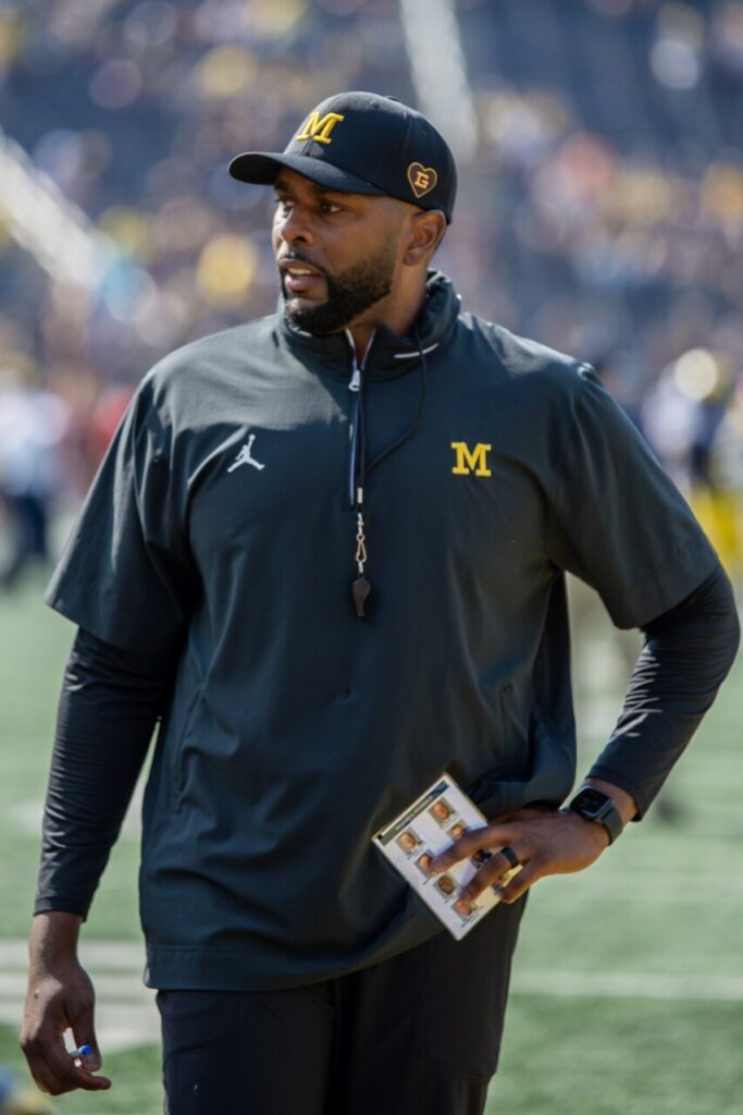 On January 26, 2024, Moore was named Michigan’s 21st head football coach following Harbaugh’s departure to the Los Angeles Chargers, agreeing to a five-year, $27.5 million contract. He was the first African American to be hired as head coach at the University of Michigan.[23][24] On August 4, 2024, ESPN reported that a draft of a notice of allegations from the National Collegiate Athletic Association (NCAA) concerning the sign-stealing scandal indicated that Moore was one of seven members of Michigan’s 2023 coaching staff accused of violating NCAA rules. The draft alleges that in October 2023 Moore deleted a thread containing 52 text messages with Connor Stalions, former Michigan staffer.[25] Moore later produced the deleted messages to the NCAA, which were found to contain no incriminating information.[26] In November 2024, Moore secured a commitment from the No. 1 overall ranked high school recruit in the nation, quarterback Bryce Underwood, in his first recruiting class as a head coach.[27]