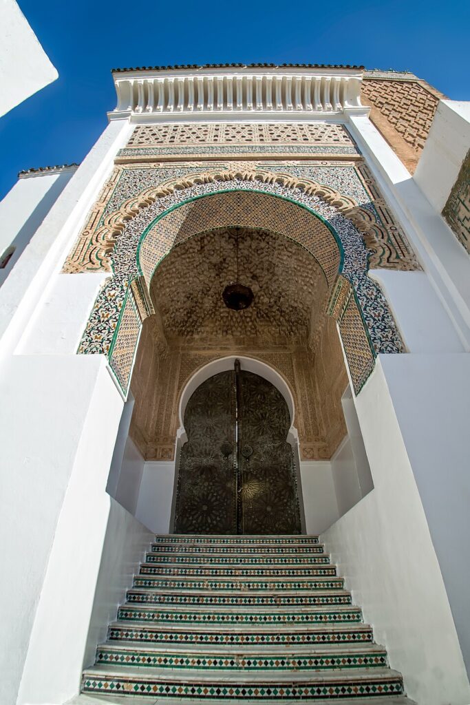 The complex contains several religious buildings including the mosque, mausoleum, madrasa and the hamam. The mosque has the main entrance resembling that of the several other Moorish architectures from Córdoba to Kairouan. The entrance leads to the gallery of plaster paintings. On top of the dome exists muqarnas. It continues to the stairs which resemble that of the Puerta del Sol, Toledo. The wooden doors are decorated with bronze, and they lead to the sahn with the fountain in the middle and surrounded by corridors and prayer hall.