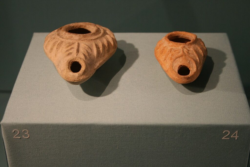 Slipper lamps with palm-branch motif in exhibit for Egypt and Ancient Near in a museum in Atlanta