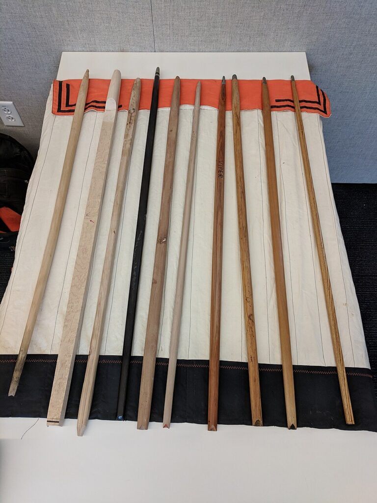 The poles used in the game, collectively known as “snow snakes”, have different names depending on their length. The smallest poles used are the six-inch-long “snow darts”.[1] The next size up is the three-foot-long “short snake”,[4] also known as a “mud cat”.[3] Longer poles are known only as “snow snakes”, and can be anywhere from six to ten feet in length.[1] Snow snakes can be made from a variety of materials. In the Sioux tribe, they were traditionally made of bone, with feathers trailing behind for symbolic decoration.[1] Other tribes traditionally used native North American hardwoods, such as maple, oak, apple, hickory, and juneberry.[3] In modern times, other hardwoods not traditionally available, such as ebony, have become popular materials for snow snakes.[3] Many players customize their snow snakes by decorating them with colorful designs or adding minor modifications, such as waxing the wooden surface.[1]