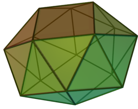 In geometry, the snub square antiprism is the Johnson solid that can be constructed by snubbing the square antiprism. It can alternatively be imagined as two squares connected by two layers of triangles, like a regular icosahedron. It is one of the elementary Johnson solids that do not arise from “cut and paste” manipulations of the Platonic and Archimedean solids. However, it is a relative of the icosahedron that has fourfold symmetry instead of threefold. It has 26 faces: 2 squares and 24 triangles; and two types of edges: triangle-square, triangle-triangle.