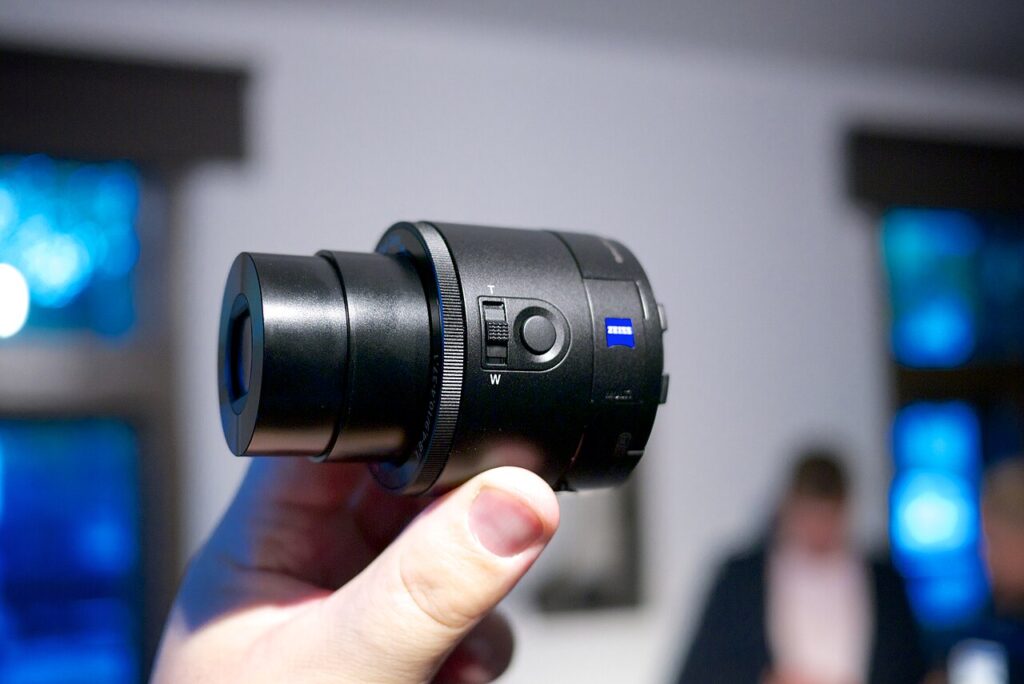 The Sony Cyber-shot DSC-QX100 is a mobile device-mountable lens-style compact camera manufactured by Sony. Announced on September 3, 2014, the QX100 is one of Sony’s “Smart Lens“ cameras, alongside the QX1, QX10 and QX30, that are specifically designed to be used with a smartphone. Its highlight features are its 1-inch (13.2 x 8.8 mm) backside-illuminated Exmor R CMOS sensor, with 20.2 megapixels, Æ’/1.8 to Æ’/4.9 Carl ZEISS® Vario-Sonnar T* lens and a 3.6x (28–100 mm) optical zoom, all taken straight from the Sony RX100 II premium compact camera.[1]