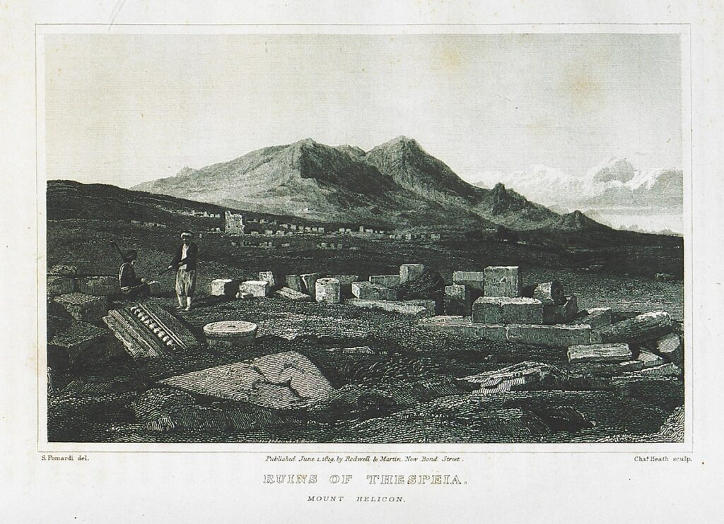 Ruins of Thespeia, Mount Helicon. Mount Helicon was considered to be a source of poetic inspiration in classic culture. From Edward Dodwell’s A Classical and Topographical Tour through Greece, during the Years 1801, 1805, and 1806, Vol. ΙΙ (London: Rodwell & Martin, 1819).