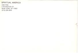 Spiritual America was a short‑lived, artist‑run gallery at 5 Rivington Street on Manhattan’s Lower East Side that operated from October 28, 1983, to March 1984. The operation kept irregular hours and appointment‑only viewings.[1][2] The gallery was founded by Kim Fine who mounted the first presentation of Richard Prince’s photograph later widely titled Spiritual America (1983), Prince’s rephotograph of a 1970s image of Brooke Shields by Gary Gross, out of her apartment. [1] Fine’s presentation emphasized difficulty of access and a reverential preference for blacked‑out windows, black‑painted walls, and a single source of light.[2][1] The initial black‑on‑white invitation cards read “By Richard Prince, a Photograph of Brooke Shields by Gary Gross,” omitted hours and dates, and used the password “TESTIMONY” for entry; the card survives in ephemera collections with Fine’s name and address as the letterhead.