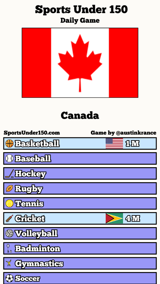 Players are presented with a list of ten sports: basketball, baseball, badminton, cricket, hockey, gymnastics, rugby, football, tennis, and volleyball.[1] One by one, the game provides a random country. For each country, the player must assign one of the available sports where that nation is ranked the highest. Once a sport is used, it cannot be selected again.