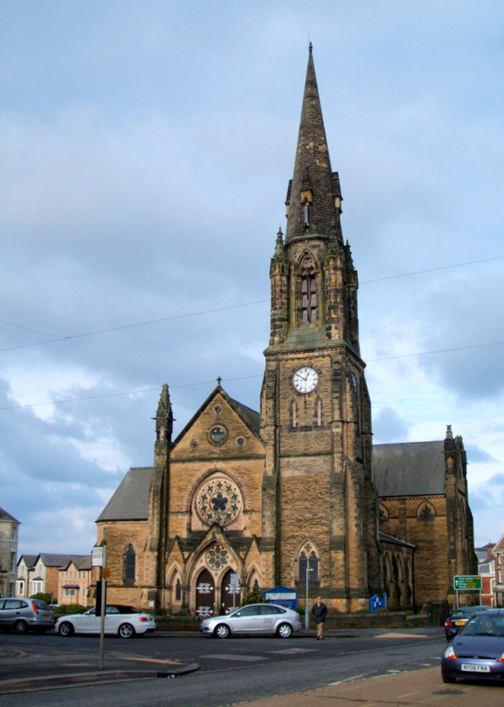 The church was constructed for the Congregational Union of England and Wales, its third church in the town after ones on Eastborough and Westborough, and is now part of the United Reformed Church. It was built between 1864 and 1868, to a design by Henry Francis Lockwood and William Mawson, the funding coming from Titus Salt. It is in a 13th-century Gothic revival style, and is described by Nikolaus Pevsner as being “as spectacular as any Scarborough church”. The building was grade II listed in 1973, and upgraded to grade II* in 1993.[1][2][3][4]