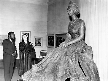 A bronze sculpture of Elizabeth II by the Nigerian sculptor Ben Enwonwu was commissioned by the Queen on her visit to Nigeria in 1956, and she sat for Enwonwu in London in 1957. It was completed by Enwonwu in London and exhibited by him at the Royal Society of British Artists exhibition in London in November 1957.[1][2] The over life-sized statue depicts the Queen seated with her hands in her lap.[2]