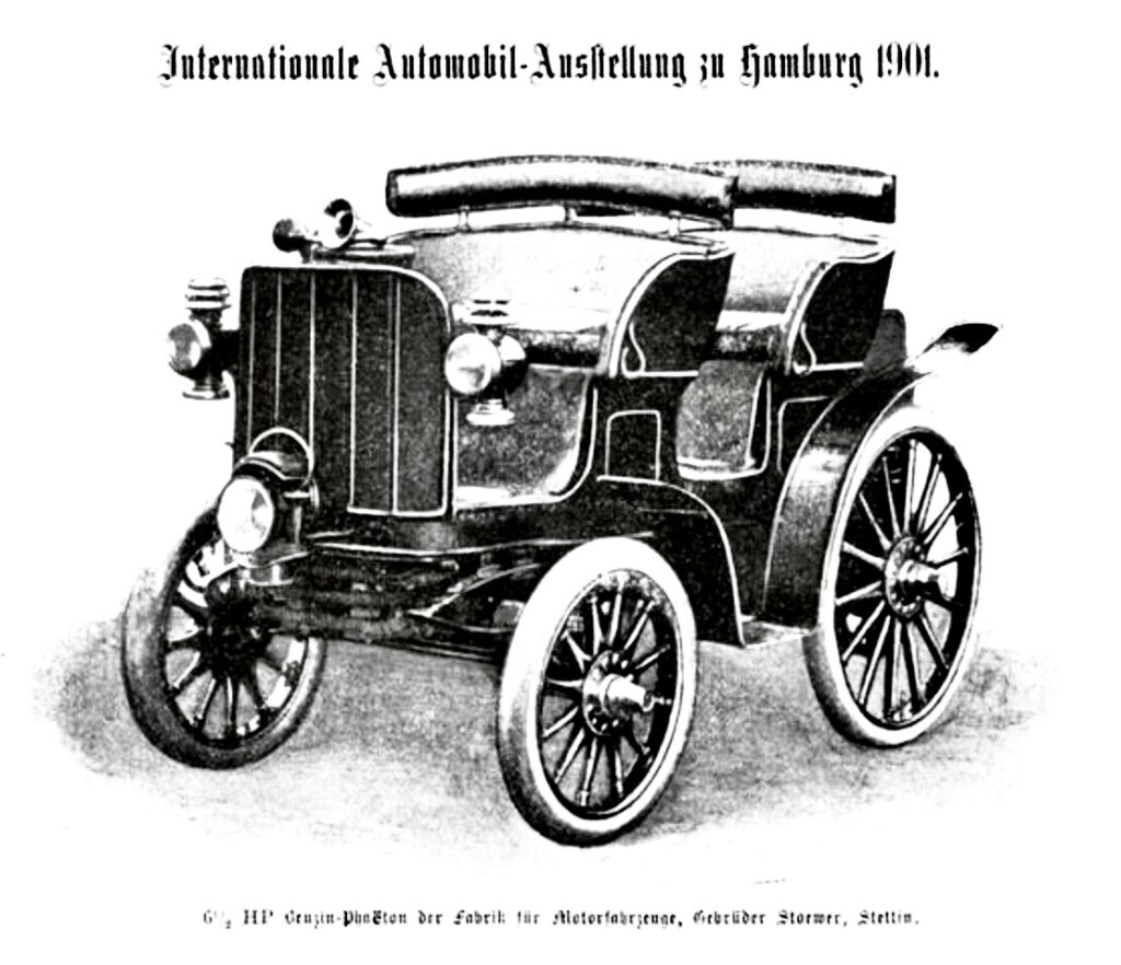 The car was a multi-seater convertible with a 2.1-liter inline two-cylinder engine with a power output of 6.5Â PS (4.8Â kW). It had a manual transmission where the gears were already engaged. The Stoewer 6,5Â HP motor car was presented at the international motor show in Hamburg in 1901.[1] At the fair, a Duc Tonneau, a limousine, and a Phaeton were presented. In front of the exhibition grounds, a 6,5Â HP from the year 1899 was presented, which had covered the route from Stettin to Hamburg on its own wheels in 15 hours. In the year 1900, the same vehicle already traveled the route from Stettin to Paris. In addition to the vehicles with two-cylinder internal combustion engines, electric vehicles from the company Stoewer were also showcased. The six electric vehicles were introduced by the engineer and manager of the electrical department, W. Zimmermann. The range of the vehicles with batteries was between 60 and 90Â km.