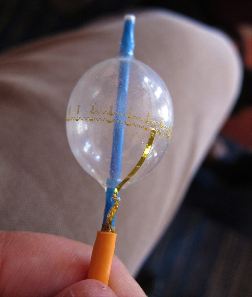 Wrapped around this cardiac balloon catheter are temperature and EKG sensors and LEDs. The wires are stretchable coils. It is manufactured with a lift-off MEMS process. The etched silicon is then stretched and attached to a polymer backing. Silicon usage is minimized over the substrate and the ensemble is quite flexible, to survive inflation and deflation of the balloon.