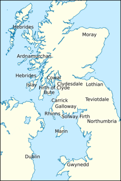 - ^ The text reads “biodhba Bretan, bádhudh Gall, loingseach Íle is Arann“.[64] One possible interpretation of this source is that it is evidence that Máel Coluim was forced to flee to the islands by his rival kinsman, Cináed mac Duib, King of Alba.[65] Another interpretation is that it refers to a military campaign conducted against the islands. The initial clause, certainly appears to refer to violence, as it describes Máel Coluim as “enemy of Britons” and “battler of Gaill“.[64]