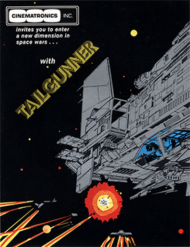 Tail Gunner is a monochrome vector arcade game created by Vectorbeam in 1979. The premise of the game is that the player is the tailgunner of a large space ship. Enemy spacecraft attack the vessel in groups of three, and the player must aim a set of crosshairs and shoot the enemies before they slip past the player’s cannons. Because of the game’s viewpoint, instead of appearing to fly into the starfield, the stars move toward the left and center of the screen.[2]