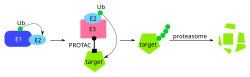 10. ^ Sakamoto KM, Kim KB, Kumagai A, Mercurio F, Crews CM, Deshaies RJ (July 2001). “Protacs: chimeric molecules that target proteins to the Skp1-Cullin-F box complex for ubiquitination and degradation”. Proceedings of the National Academy of Sciences of the United States of America. 98 (15): 8554–8559. Bibcode:2001PNAS…98.8554S. doi:10.1073/pnas.141230798. PMC 37474. PMID 11438690.