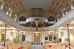 Interior view from front, includes 17th century crucifix