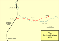 The Shrewsbury and Hereford Railway opened its standard gauge line throughout on 6 December 1852.[1] It had a station at Woofferton, and Tenbury Wells[note 1] was a little over five miles distant. It became evident that communities directly served by a railway prospered, and those not so connected declined, and business interests in Tenbury realised that their town was at a disadvantage.