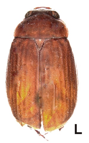Adults reach a length of about 6.6–7.9 mm. The body is reddish brown. The labroclypeus surface has a few erect setae and the disc of the frons has a few single setae. The smooth area in front of the eye is approximately four times as wide as long.[3]