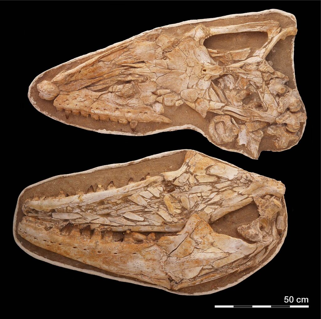 Neurovascular foramina line this margin, increasing in size as they progress towards the back of the skull. The texture of the maxilla’s surface is rough, which is especially apparent in larger individual, caused by a network of veined grooves to house blood vessels. The external nares extend from and to above the fourth and twelfth maxillary teeth. The jugal bone, which is located just below the eye, is broad and robust. The frontal bone is short and broad, shaped almost like an isosceles triangle, with large neurovascular foramina at the center. The pineal foramen, which contains the parietal eye, is small and long. The supratemporal fenestrae, large openings between the eyes and the back end of the skull, take up nearly a quarter of the entire skull length and are somewhat triangular. The dentary, the tooth-bearing bone of the lower jaw, is short, wide, robust, and curved concave towards the upper jaws. Many bones of the upper jaw are tightly sutured together; its two tooth-bearing bones the premaxilla and maxilla were connected through interlocking joints containing an unusual series of flanges and grooves while an interdigitating set of tongue-and-groove joints secure the maxilla and prefrontal bone.[1]