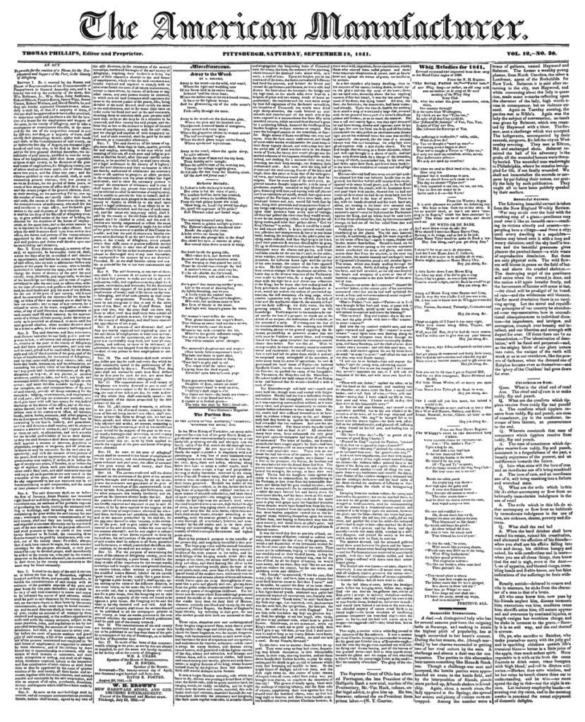 - ^ “Mercury and Manufacturer”. The American Manufacturer. Pittsburgh. 3 September 1842. p. 3, col. 1.“Daily Morning Post”. The American Manufacturer. Pittsburgh. 3 September 1842. p. 3, col. 1.
