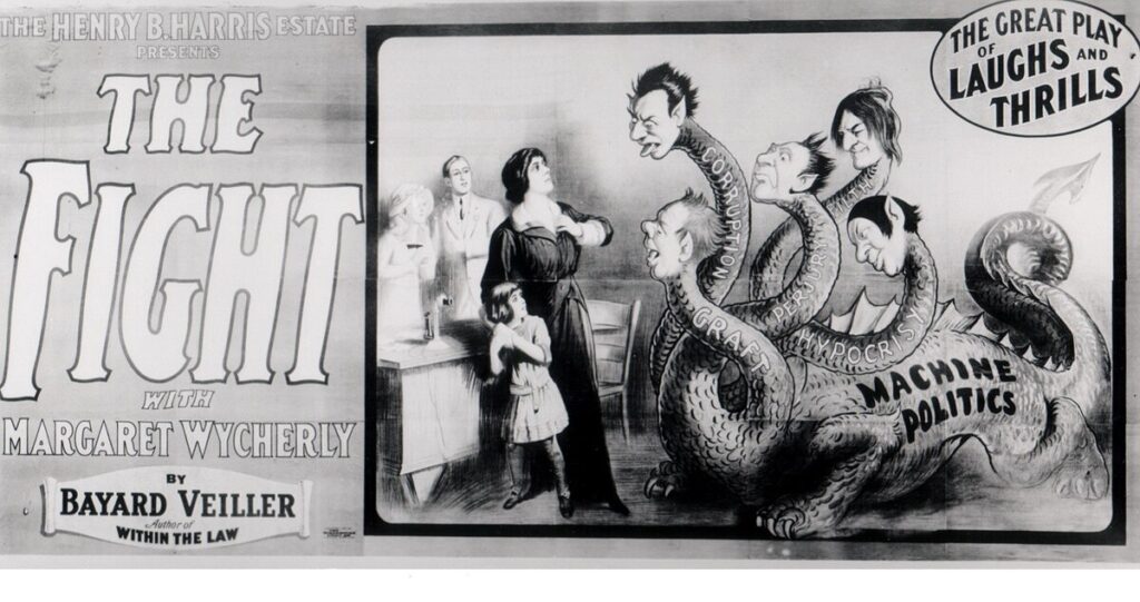 The Fight is a lost[1] 1915 silent film social drama directed by George Lederer and starring Margaret Wycherly(her film debut). The story was by Wycherly’s husband, writer Bayard Veiller and is based on his 1912 Broadway play version. The stage version was produced by The Estate of Henry B. Harris who died in the Titanic Disaster earlier in 1912.[2]