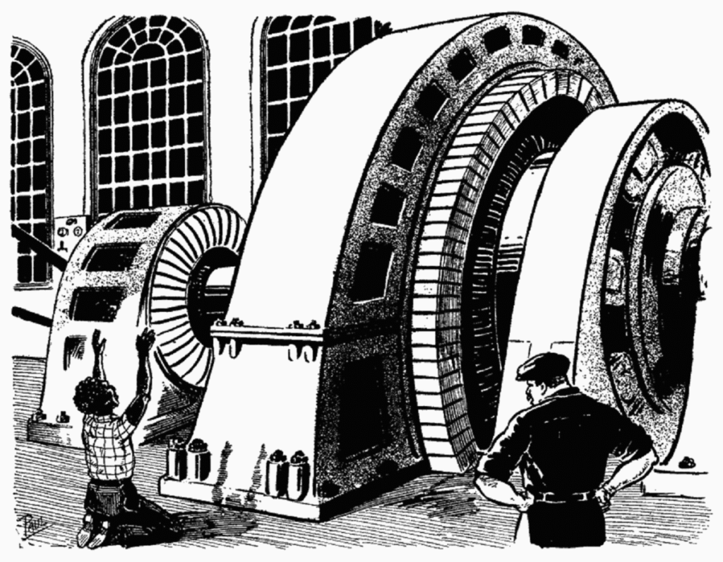 Azuma-zi is powerfully impressed by the humming, whirling machinery and comes to believe that the big dynamo is indeed a god. He starts to worship it; he salaams to it when he arrives at work, prays to it to save him from Holroyd, cleans and polishes it with devotional care, and anoints it with oil – by which he unintentionally damages an area of the insulating varnish on the coils, and on discovering this Holroyd orders him to stay away from the machine with threats of violence.