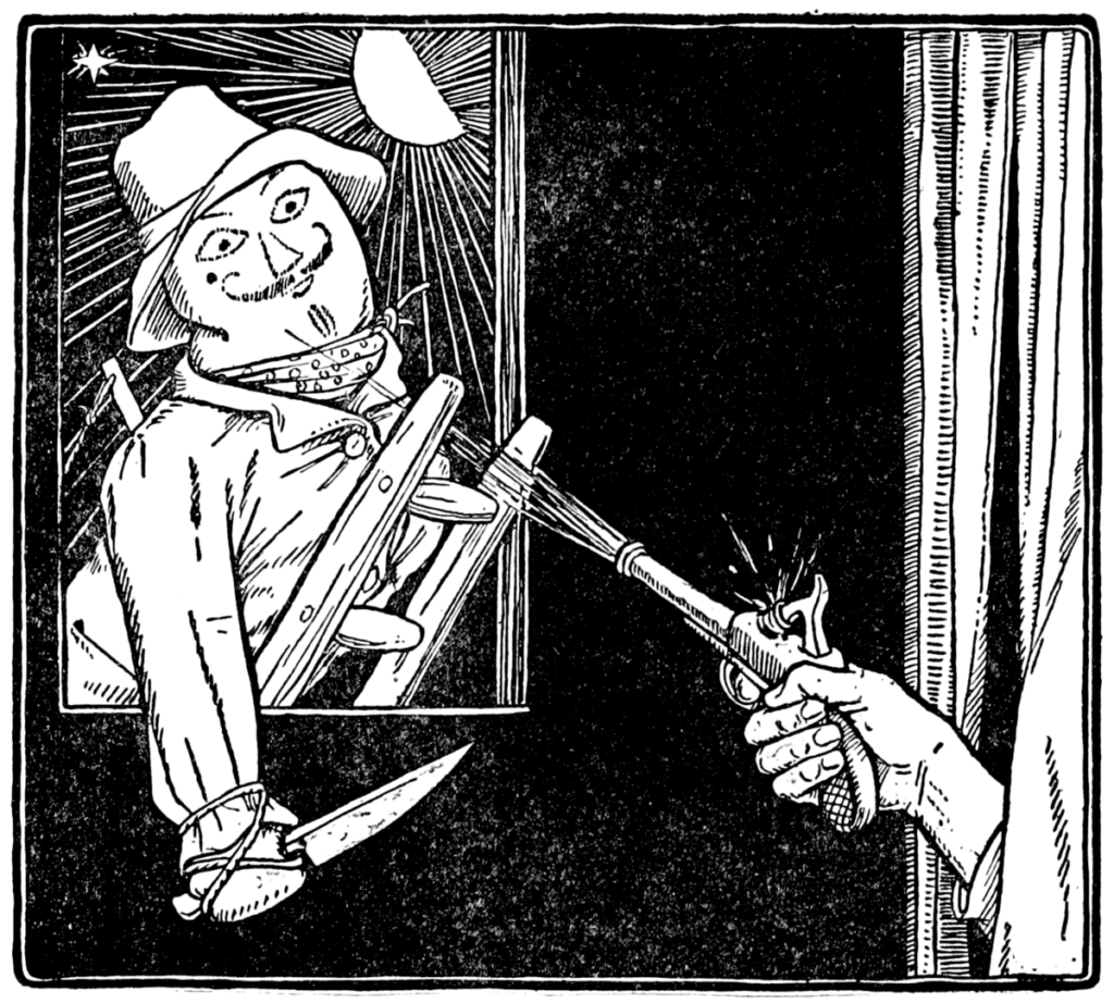 The squire denies him once more, asking if he could steal the sheet off his bed and his wife’s shift. The Master Thief makes a dummy with the appearance of a man, and when he puts it at the window, the squire shoots it, and the boy lets it drop. Fearing talk, the squire goes to bury it, and the Master Thief, pretending to be the squire, acquires the sheet and the shift on the pretext that they are needed to clean up the blood.