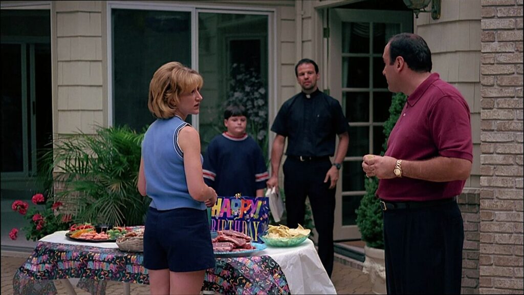 At a birthday party for Tony’s adolescent son A.J., Christopher, frustrated about not receiving recognition for killing Kolar, tells Tony he is thinking of turning his life story into a Hollywood script, which Tony angrily forbids.