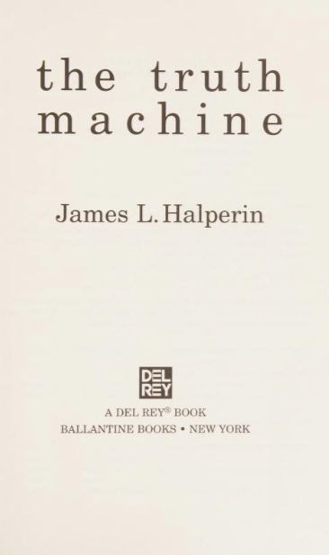 The Truth Machine (1996) is a science fiction novel by James L. Halperin about a genius who invents an infallible lie detector. Soon, every citizen must pass a thorough test under a Truth Machine to get a job or receive any sort of license. Eventually, people begin wearing them all the time, thus eliminating dishonesty in all parts of human interaction, and eliminating crime, terrorism and a great deal of general social problems.