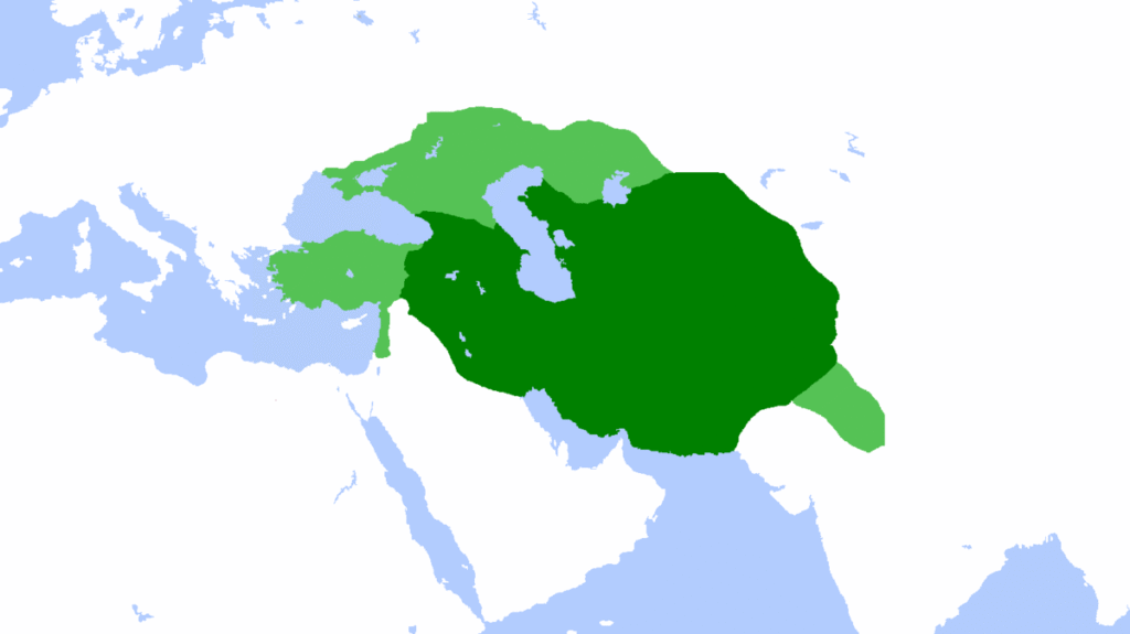 Timurid Empire at its greatest extent (without vassals) – dark green is territories and light green is areas subjugated to Timur’s raids.