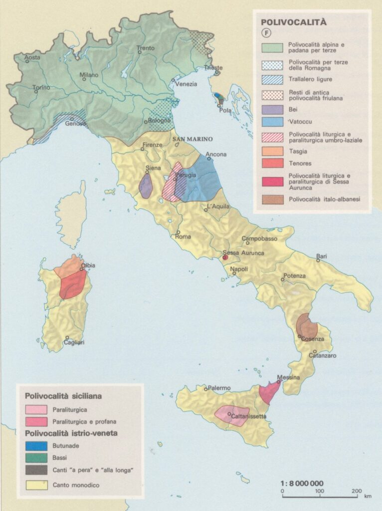 [[File:Map Folklore I 1990 – Polivocalità – Touring Club Italiano CART-TEM-096 (cropped).jpg|thumb|Map of polyphonic folk singing in Italy]]