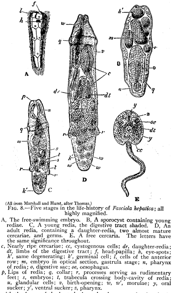 After the sporocyst the larva forms. The first development from it forms the redia.[5] They have a mouth which allows them to have an advantage to their competitors because they can just consume them and will either produce more rediae or start to form cercariae.