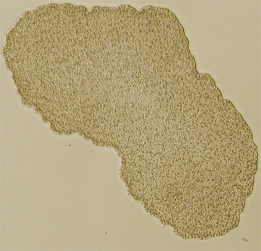 Trichoplax generally has a thinly flattened, plate-like body in cross-section around half a millimetre, occasionally up to two or three millimetres. The body is usually only about 25 μm thick. Because they are so thin and fragile, and because the cilia which they use for locomotion are only loosely coordinated, they are constantly being split into two or three separate clones when their cilia moves in opposite directions, causing microfractures in the animal’s epithelium. One hypothesis is that the larger a motile animal lacking a nervous system is, the less coordinated its locomotion becomes, placing an upper limit on their possible size.[7][8] These colorlessly gray organisms are so thin they are transparent when illuminated from behind, and in most cases are barely visible to the naked eye. Like the single-celled amoebae, which they superficially resemble, they continually change their external shape. In addition, spherical phases occasionally form. These may facilitate movement to new habitats.