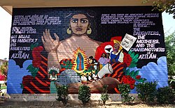 The mural depicts various generation of Mexican and Chicana women engaged in daily life and activist work like the alongside depictions of the Virgen de Guadalupe and the stone head of . All of these different women are cradled by a towering central female figure. |