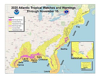 39. ^ National Weather Service Corpus Christi, Texas [@NWSCorpus] (November 16, 2020). “With 30 named storms in the Atlantic Basin in 2020 and 12 of them making US landfalls, every mile of the US Atlantic coast has been under a tropical watch or warning (TS, Hur, Storm Surge). A busy season for @NWSNHC and coastal NWS offices” (Tweet). Retrieved August 9, 2021 – via Twitter.
