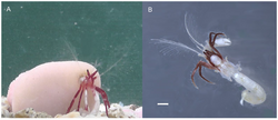 [[File:Diogenes heteropsammicola hermit crab, in and out of coral.png|thumb|center|Diogenes heteropsammicola in a walking coral (left) and swimming freely (right)]] |