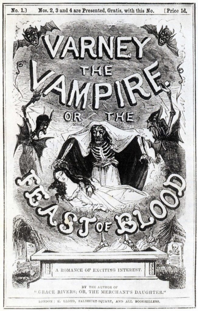 Varney the Vampire; or, the Feast of Blood is a Victorian-era serialized gothic horror story variously attributed to James Malcolm Rymer and Thomas Peckett Prest. It first appeared in 1845–1847 as a series of weekly cheap pamphlets of the kind then known as “penny dreadfuls“. The author was paid by the typeset line,[1] so when the story was published in book form in 1847, it was of epic length: the original edition ran to 876 double-columned pages[2] and 232 chapters.[3] Altogether it totals nearly 667,000 words.[4]