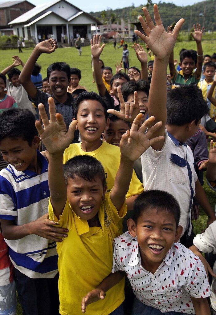 Indonesian children of a village just inland from the coast of Sumatra, Indonesia, celebrate as food and water are flown to their village
