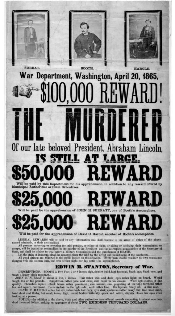 [[File:John Wilkes Booth wanted poster new.jpg|thumb|Wanted poster for [[John Wilkes Booth]] and his accomplices in the [[assassination of Abraham Lincoln]]]]
