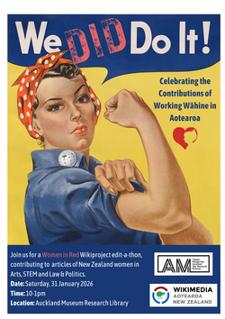 This event will be centred on the working women of New Zealand and will contribute to the Women in Red Wikiproject! We will focus on editing stub or start-class articles of New Zealand women who have worked or still work in three key areas – Arts, STEM and Law & Politics.