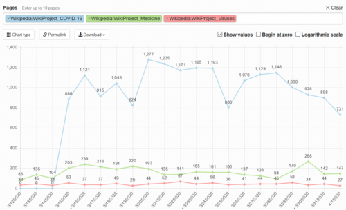Viewership of WikiProject Medicine, WikiProject Viruses, and WikiProject COVID-19 in the month of March 2020